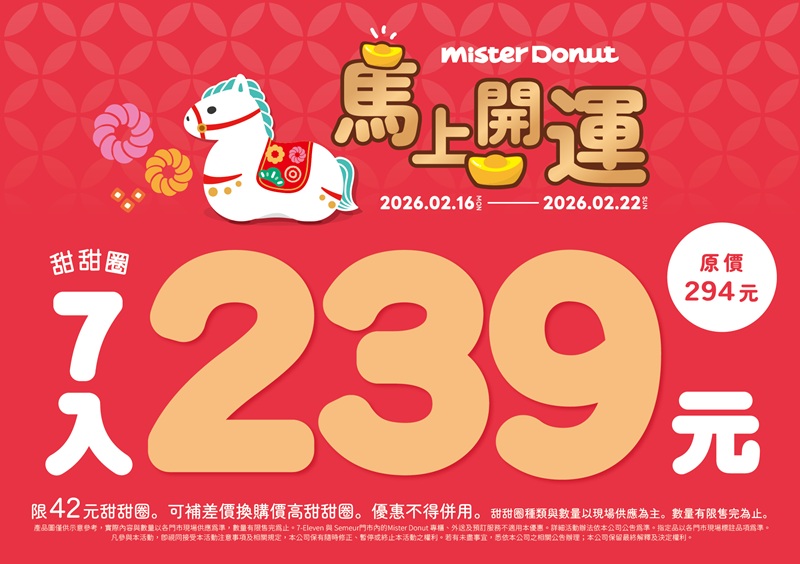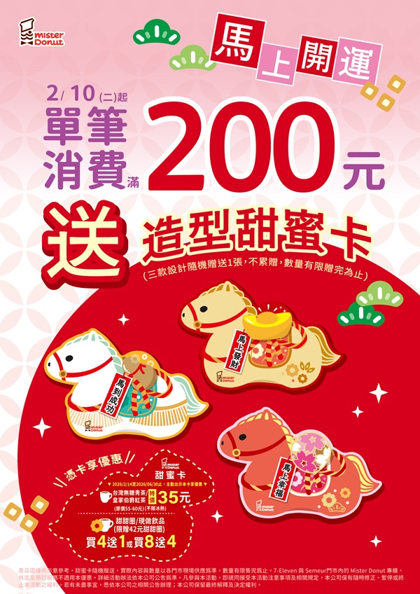 1. 單筆消費限贈送乙組,不可累積兌換。 2. 限當場一次領取, 7-ELEVEN 及 Semeur 門市內 Mister Donut專櫃、 外送外賣及預訂服務不適用本優惠 3. 甜蜜卡優惠詳情請參考 該實體卡片背面說明。 3. 商品種類數量以各門市 實際可贈送情形為準,贈完為止。 Mister Donut 保留活動變更及調整之權利 如有變動請以 Mister Donut 官網公告為主 |