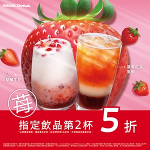 1. 第 2 件 5 折為價低優先折扣, 自帶飲料杯可再享環保優惠 5 元。 2. 指定商品為 ㄇㄨˊ~草莓牛奶、草莓紅茶乳酸 3. 除自帶杯優惠外, 不得與其他現作飲品優惠合併併用。 4. 部份門市未販售飲品, 依 Mister Donut 官網公告為準 https://pse.is/4y3mqy 5. 限當場一次領取, 7-ELEVEN 及 Semeur 門市內 Mister Donut專櫃、 外送外賣及預訂服務不適用本優惠。 6. 商品種類數量以各門市 實際可販售情形為準,售完為止。 Mister Donut 保留活動變更及調整之權利 如有變動請以 Mister Donut 官網公告為主 |