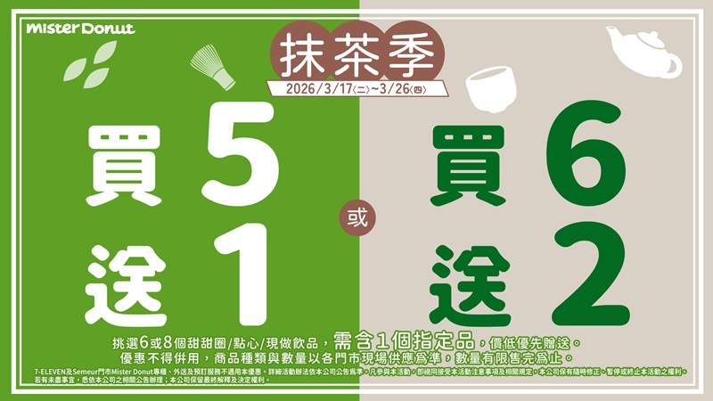 即日起至3月26日期間可享甜甜圈買5送1及買6送2優惠,